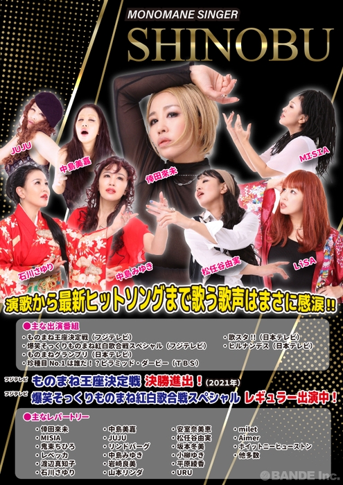 フジテレビ系列の「爆笑そっくりものまね紅白歌合戦スペシャル」レギュラー出演中!、「ものまね王座決定戦」2021年・2022年決勝進出!