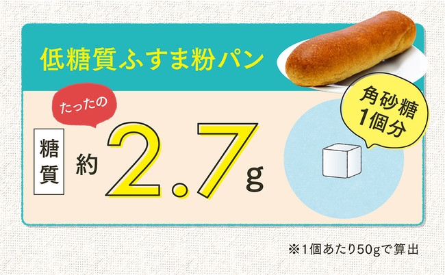 「低糖質ふすま粉パン」は独自の製造技術により、パンのおいしさを保ちながら糖質88%オフと糖類ゼロを実現。その糖質量はたったの2.7g。絹ごし豆腐1/2丁と同等の糖質量まで抑えました。普段食べているパンをこの「低糖質ふすま粉パン」に置きかえるだけで、簡単に糖質オフ。肥満ホルモンを正常化させてダイエットをサポートします。また、主原料には熊本県産小麦ふすま粉をつかい、大分県日田市の強炭酸水で“もっちりふんわり食感”に焼き上げ、食物繊維もたっぷりで栄養バランスも抜群。香料や着色料、保存料など合成添加物は一切つかわず天然素材を贅沢に使用しているので、安心しておいしく召し上がっていただけます。