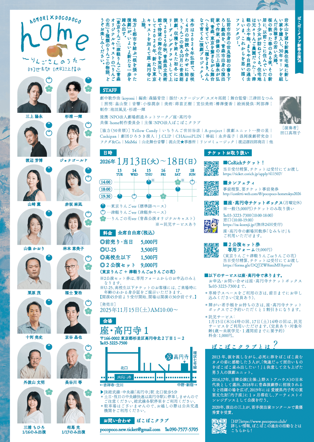 ぽこぽこクラブ主催、新春公演’26 AOMORI×POCOPOCO『home~りんごさんのうた~』が2026年1月13日 (火) 〜 2026年1月18日 (日)に座・高円寺1(東京都 杉並区 高円寺北 2-1-2)にて上演されます。 チケットはカンフェティ(運営:ロングランプランニング株式会社、東京都新宿区、代表取締役:榑松 大剛)にて発売中です。