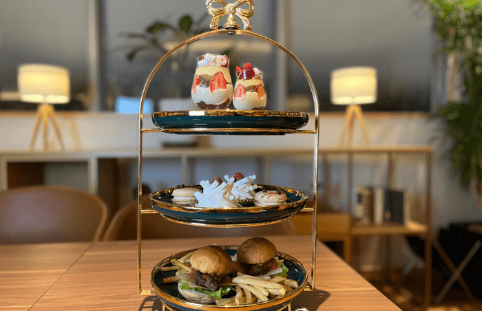 旬のいちごをたっぷり使った、ミニパフェが宝石箱のように輝いています。苺の甘酸っぱさとピスタチオの香りが口いっぱいに広がって幸せ~選べるスイーツや、信州牛のミニバーガーもついて大満足!