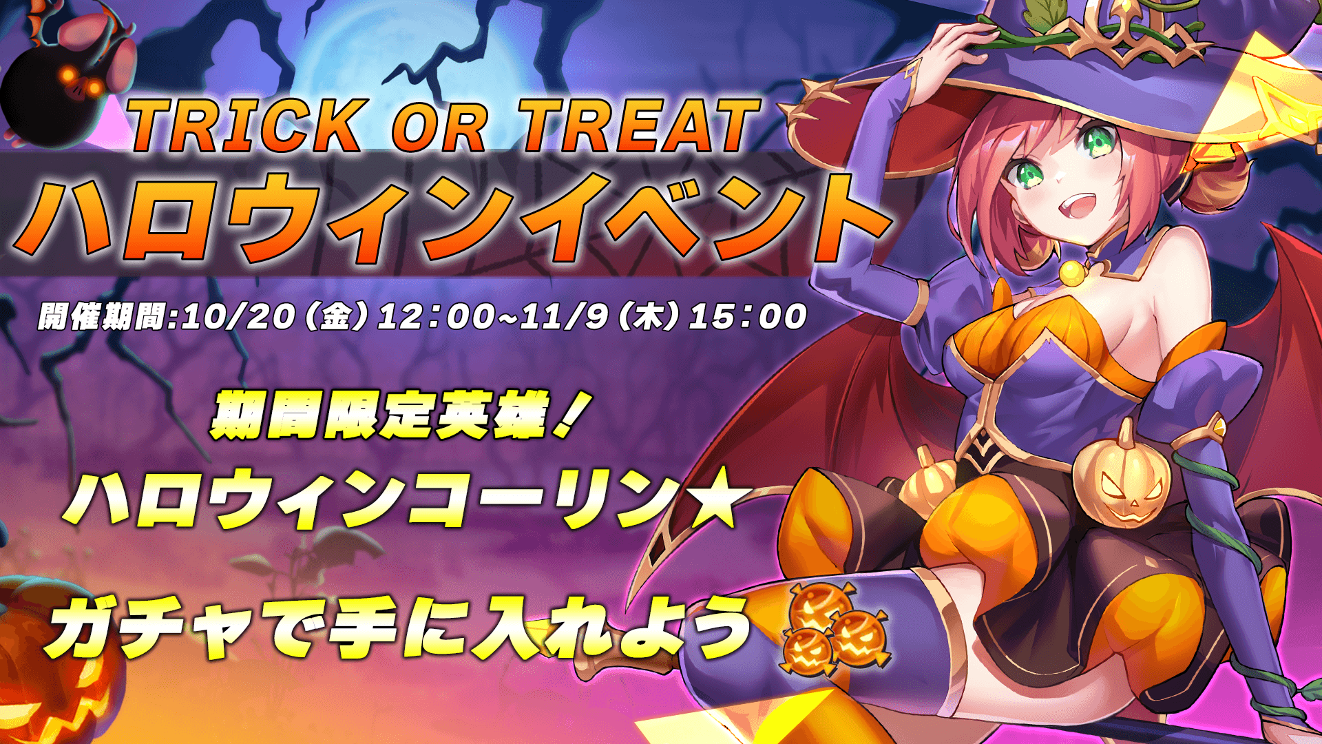 期間限定のハロウィン召喚で最強★英雄「URハロウィンコーリン★」を手に入れよう!さらにハロウィン召喚は英雄確定!ハロウィン召喚に必要なハロウィン粒子はハロウィンパックの他、ハロウィン商店、W粒子召喚10連のおまけ、耀金召喚10連のおまけで手に入ります。ぜひこの機会に最強★英雄「URハロウィンコーリン★」を手に入れましょう!