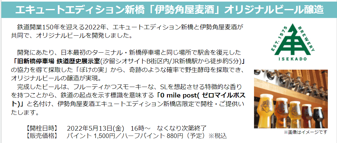 この度、鉄道開業150年を記念し、鉄道の起点を示す標識を意味する『0 mile post(ゼロマイルポスト)』と名付け、2022年5月13日(金)16時より、伊勢角屋麦酒エキュートエディション新橋店にて開栓いたします。今ここでしか味わえないオリジナルビールを、生でぜひお楽しみください。