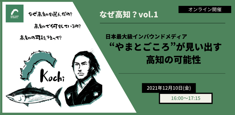 株式会社岡村文具(本社:高知県高知市 代表取締役:岡村憲男)、高知サンライズホテル(本社:高知県高知市 代表取締役:古谷博)、株式会社ツクリエ(本社:東京都千代田区 代表取締役:鈴木英樹)の3社が高知市中心市街地にて運営するシェアオフィス「BASE CAMP IN KOCHI」では、高知の魅力や可能性を深掘りするトークイベント「なぜ高知?vol.1 日本最大級インバウンドメディア“やまとごころ”が見い出す高知の可能性」を12月10日(金)にオンラインで開催します。