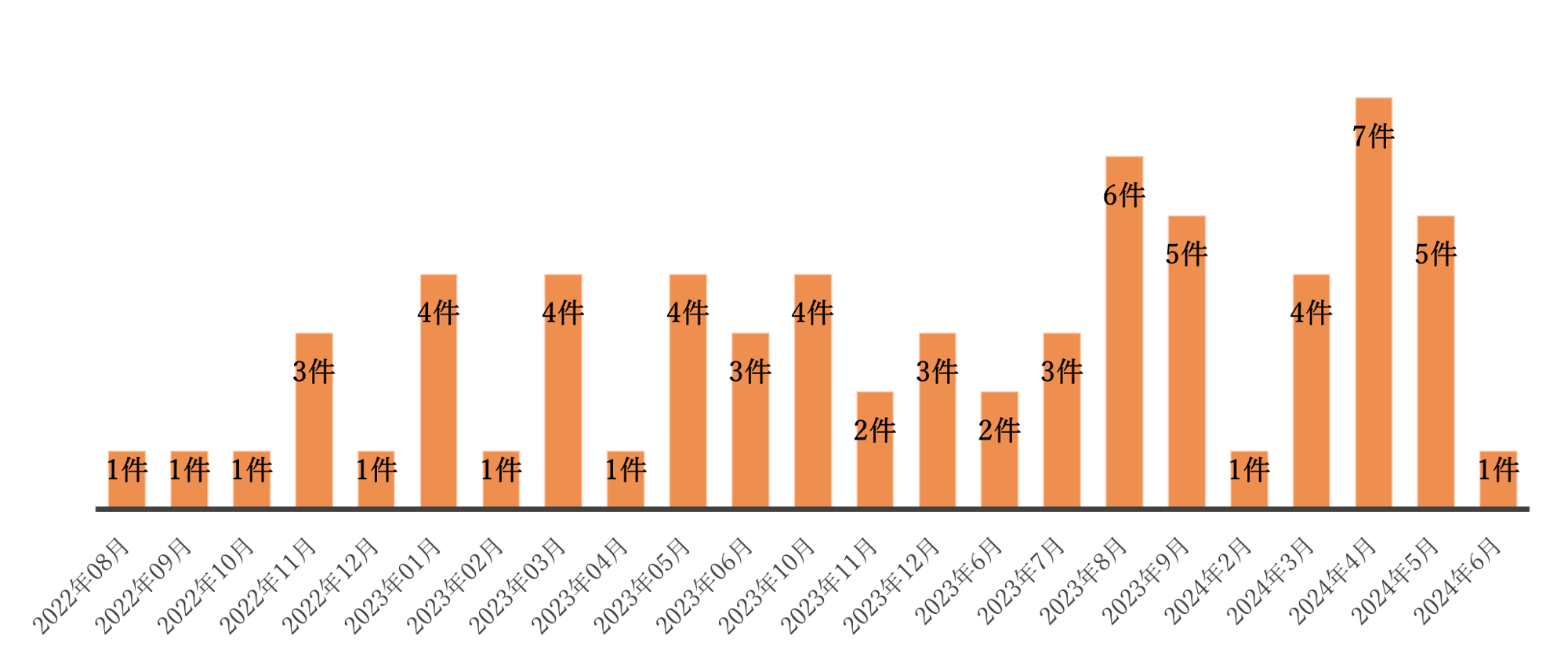 2022年度に白ナンバー義務化の影響を受け大幅に台数を伸ばし、翌年2023年度の実績は大幅に減少となりましたが、2024年に入りやや増加しました。