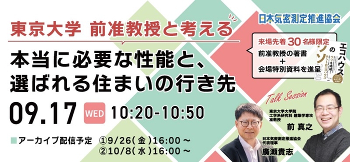 「気密測定業務と正しい測定方法をスタンダードにする」ことで日本の住宅性能の向上を目指している日本気密測定推進協会(所在地:富山県富山市野口812、代表理事:廣瀬 貴志)は、この度、当協会に技術顧問として東京大学大学院 工学系研究科 建築学専攻 准教授の『前 真之』氏をお迎えしました。それを記念し、2025年9月17日(水) 10:20~10:50にて東京ビッグサイト 南3・4ホール R-5会場(リフォーム産業フェア2025内)で『本当に必要な性能と、選ばれる住まいの行き先』をテーマに就任記念セッションを開催いたします。(先着40名)
