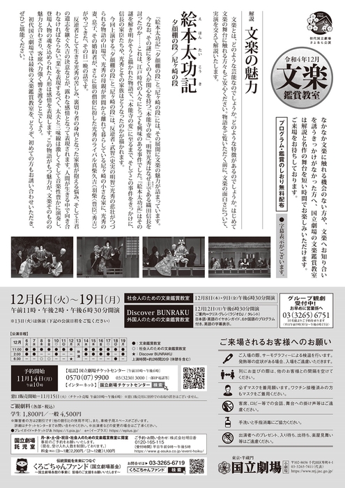 「初代国立劇場さよなら公演」令和4年12月文楽鑑賞教室/社会人のための文楽鑑賞教室『絵本太功記』上演決定 カンフェティでチケット発売