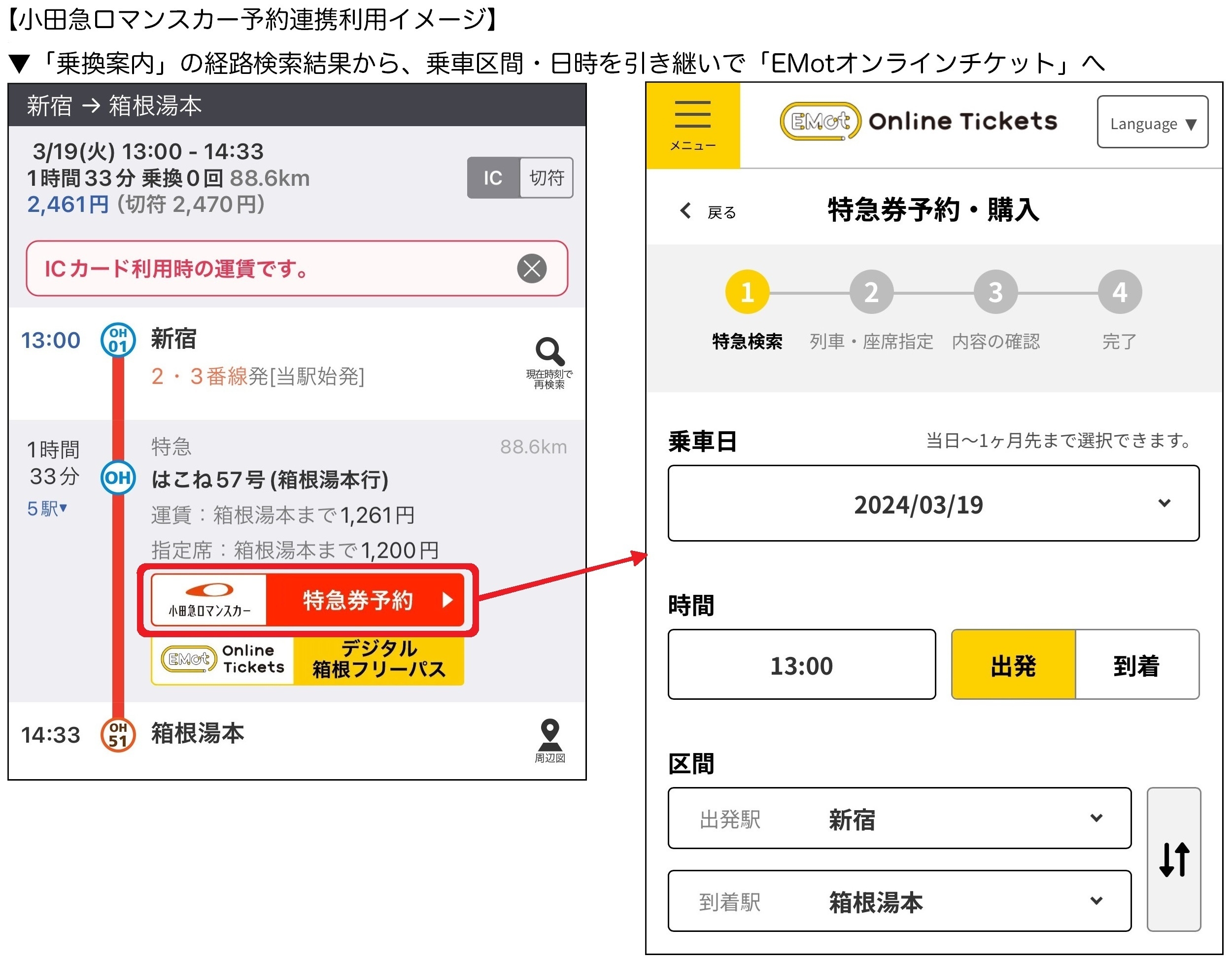 予約連携では、「乗換案内」で小田急ロマンスカーを含むルートを検索すると「特急券予約」ボタンが表示されます。タップすると乗車区間や日時を保持したまま「EMotオンラインチケット( https://www.emot-tickets.jp )」に遷移し、簡単かつ迅速にロマンスカーの特急券の予約・購入ができます。