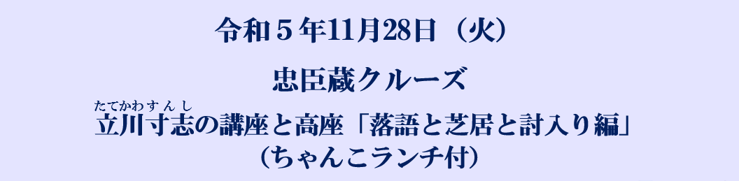 遅れてきた落語少年こと立川寸志が、江戸の蘊蓄(うんちく)と落語の「講座と高座」を務めます。母校の東京都立大学人文学部史学専攻で培った近世史の知識を活かし、歌舞伎の演目でおなじみの「仮名手本忠臣蔵 五段目」にまつわる落語に焦点を当て、噺(はなし)の背景と江戸の蘊蓄を絡めて面白可笑しくレクチャーします。昼食は、両国名物「ちゃんこ鍋」です。