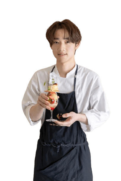 自家製パイをベースに烏龍茶のカスタードクリーム、苺を合わせたミルフィーユ仕立てのパフェに仕上げました。グラス上に甘みのある新玉ねぎのチーズケーキをのせ、仕上げに貝出汁のクリームソースをかけています。ちょっと変わった大人向けのデザートです。