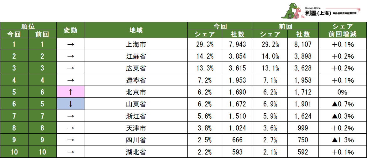 企業数の増減では、8位の「天津市」(1,024社、前回999社)、10位の「湖北省」(593社、前回592社)を除き、多くの地域で減少しています。また、「北京市」(6.2%、1,690社)と「山東省」(6.2%、1,672社)の順位が入れ替わり、山東省のシェアは前回より0.7ポイント低下しました。