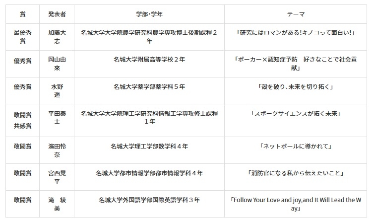 表彰式では、小原学長ら審査員からファイナリストたちにトロフィーや盾が贈られ、小原学長は農学部の後輩でもある最優秀賞の加藤さんについて「一番厳しく採点したが、キノコの魅力をよく引き出していた」と感想を語り、最後に全体の講評で「どのプレゼンテーションも素晴らしく、甲乙つけがたく審査に苦労した。これからも(開学100周年のスローガンとして掲げている)『リアライズ』の精神を持ち続けて頑張ってください」と期待しました。