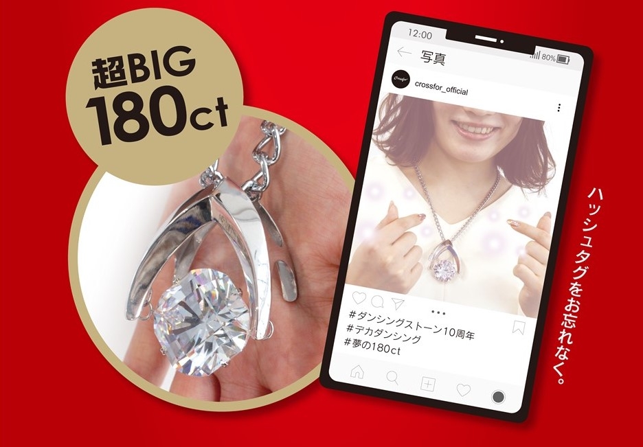 店頭にある180ct相当の超Bigダンシングストーンネックレスを着用し、ハッシュタグをつけてSNSに投稿で応募完了!