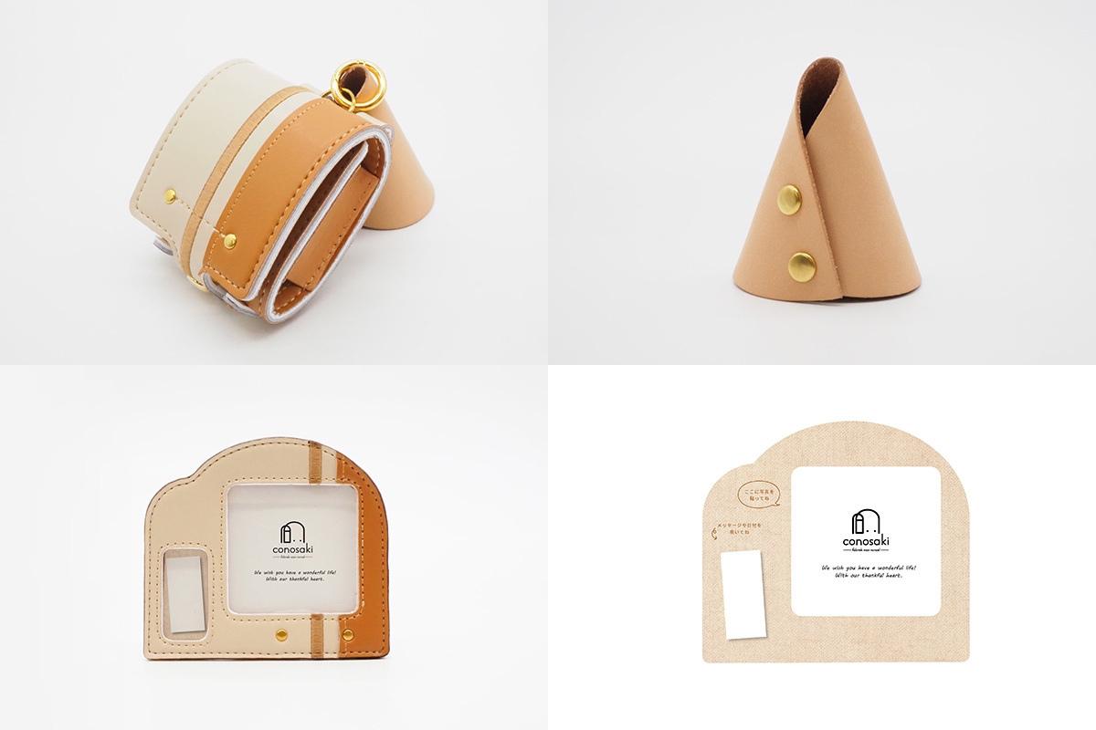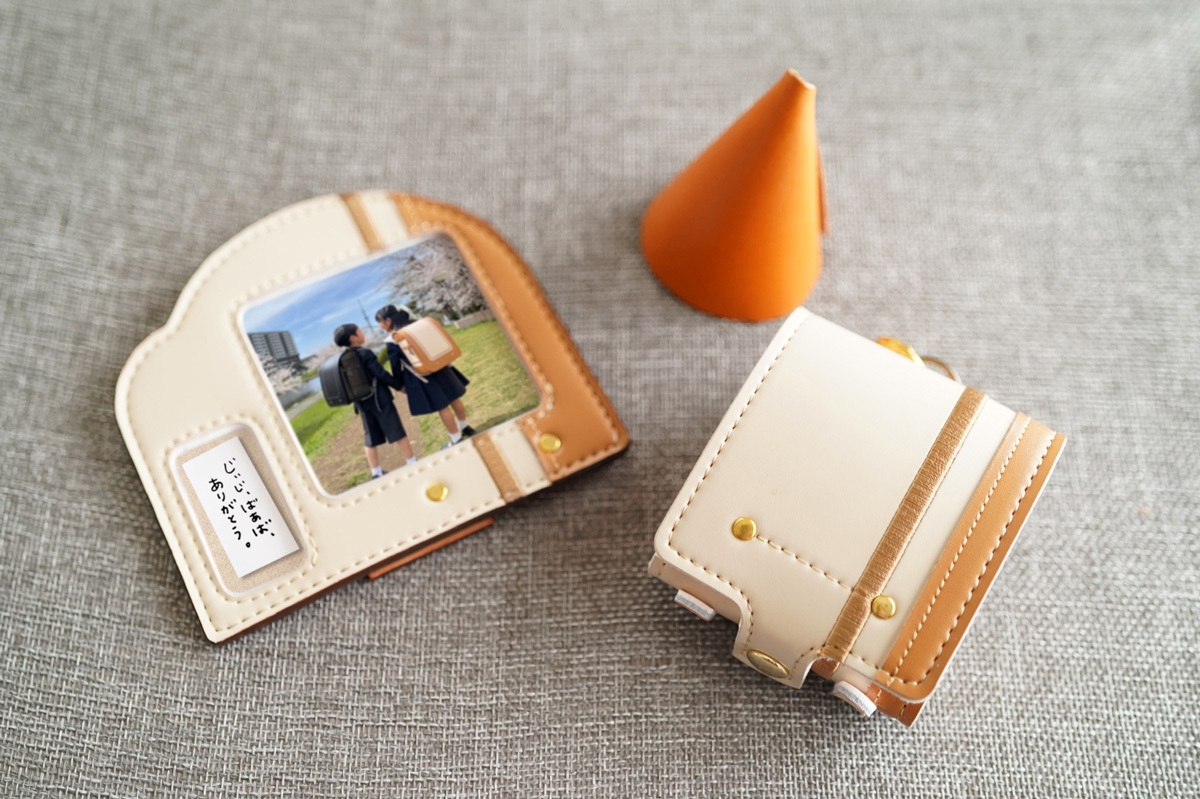 ■conosakiのリメイクサービスは、スタンド付きのミニランドセルと2つのフォトフレーム、メッセージカードをセットにした4点セット