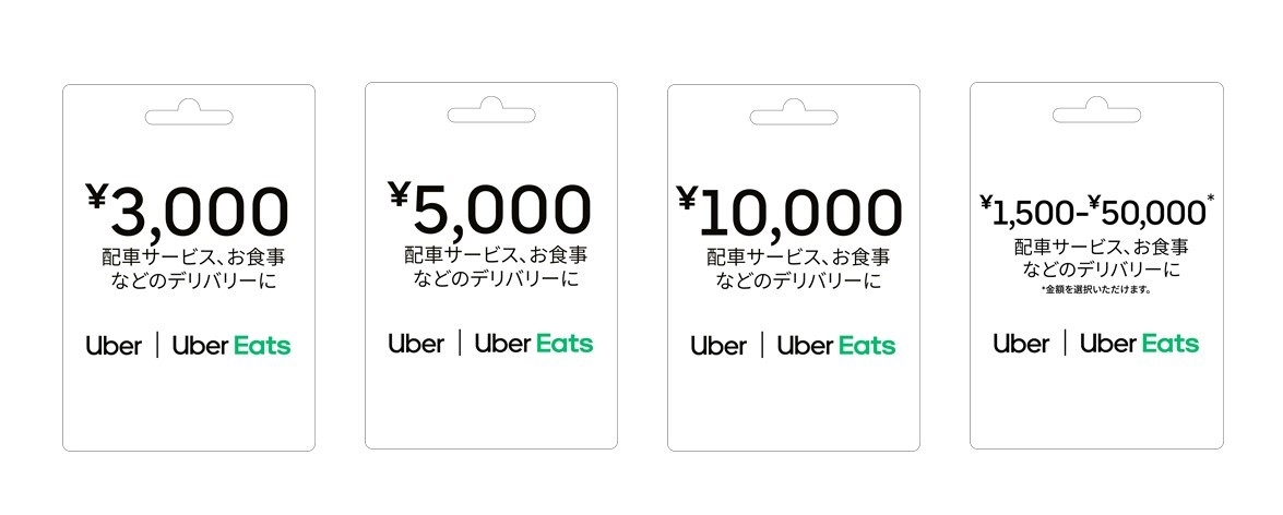 「Uber ギフトカード」は、タクシーやハイヤーを呼べる配車サービスアプリ「Uber」、お料理から食品・雑貨まで注文できるデリバリーサービスアプリ「Uber Eats」のオンラインサービスにご利用いただけるプリペイドカードです。ユーザーは、店舗(コンビニエンスストアなど)とECサイトで購入でき、「Uber」、「Uber Eats」アプリ内のWalletにギフトカード記載のコードを入力することでアカウントにチャージ可能となっております。ギフトカード購入の際に、審査や個人情報の登録は不要なので安心安全、簡単便利にお使いいただけます。