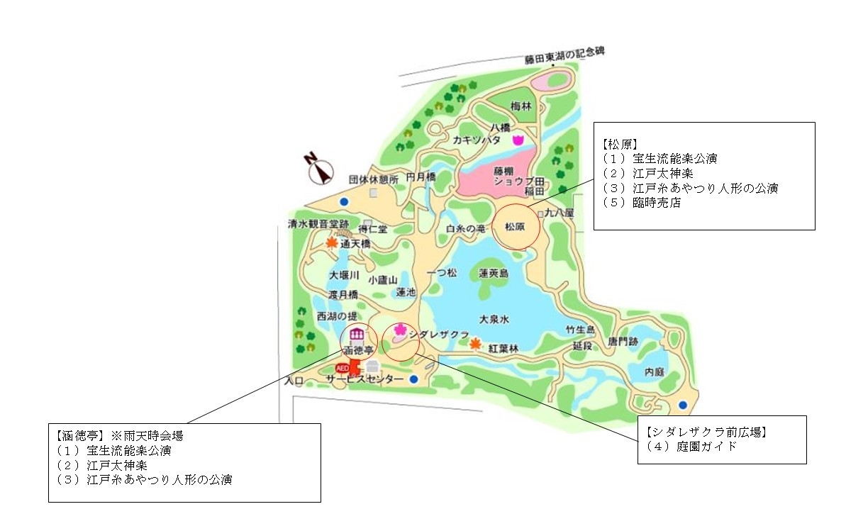※雨天の場合のみ、涵徳亭(定員70人)にて実施のため、当日先着順となります。(各回開始20分前より受付)