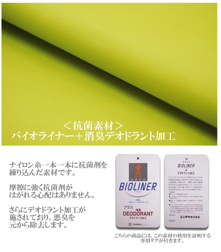 こちらは内部全面にユニチカ株式会社 抗菌消臭素材「バイオライナー+デオドラント加工」を使用しています。