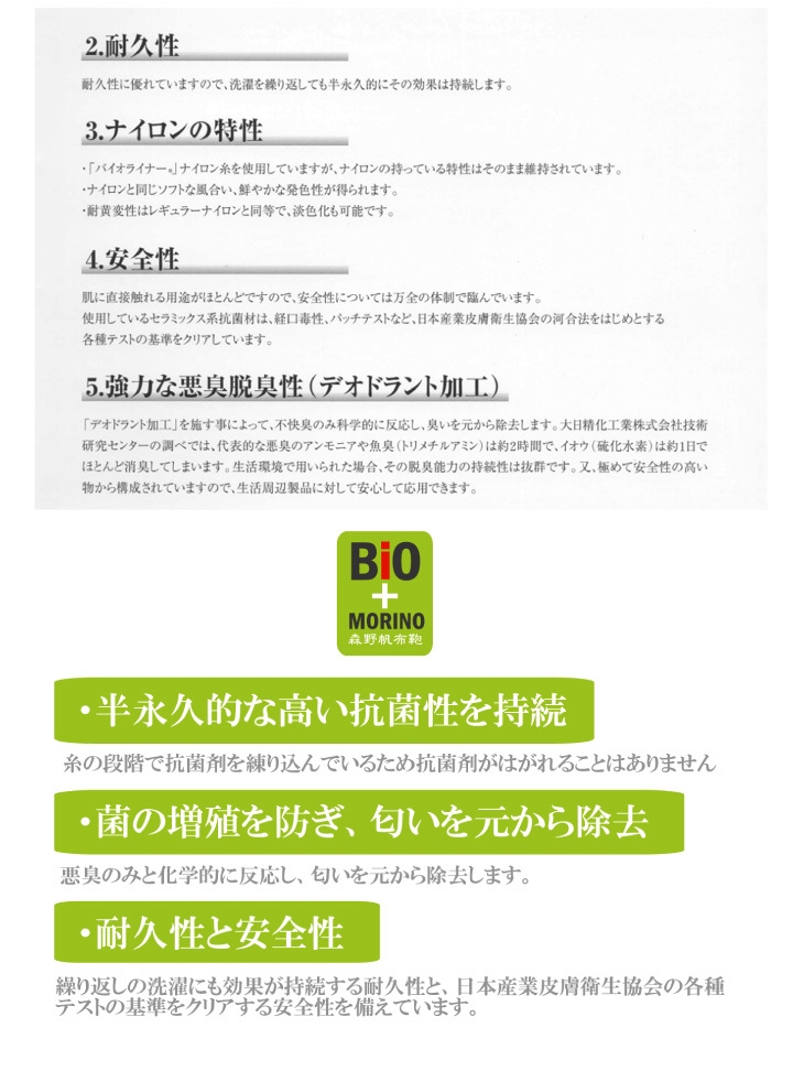 ナイロン糸1本1本に抗菌消臭剤を練り込んだ糸で織った素材ですので、摩擦でも抗菌剤が落ちにくく、その効果は半永久的に持続します。