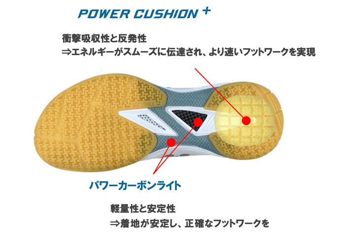 かかと部には、弊社独自の新配合・新構造の衝撃吸収反発素材「パワークッション®プラス」を搭載。高いクッション性が着地衝撃を吸収し、優れた反発性が高い推進力を生み出します。中側部のシャンクには、カーボンと硬質EVAを組み合わせたパワーカーボンライトを搭載することにより、着地が安定し正確なフットワークを実現。