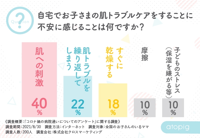 「自宅で肌トラブルケアをすることの不安はなんですか?」の質問に対して『肌への刺激(40%)』と回答した方が最も多く、次いで『肌トラブルを繰り返してしまう22%)』という結果に。