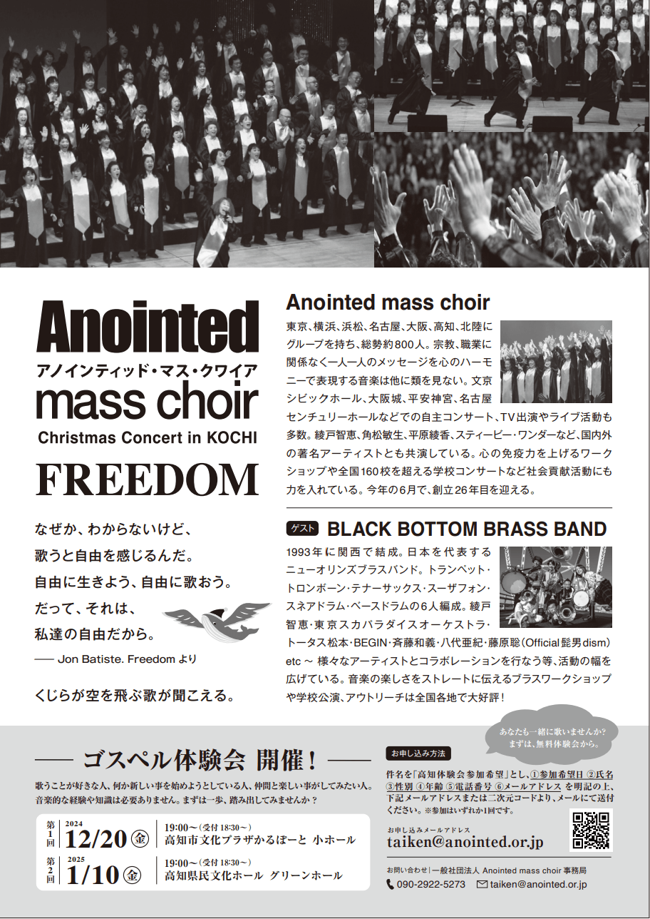 創立25周年を迎えたゴスペルグループ「一般社団法人Anointed mass choir(アノインティッド・マス・クワイア)」は、2024年12月7日(土)、高知県立県民文化ホール オレンジホールにて、コンサート「Anointed mass choir Christmas Concert in KOCHI“FREEDOM”」を開催いたします。
