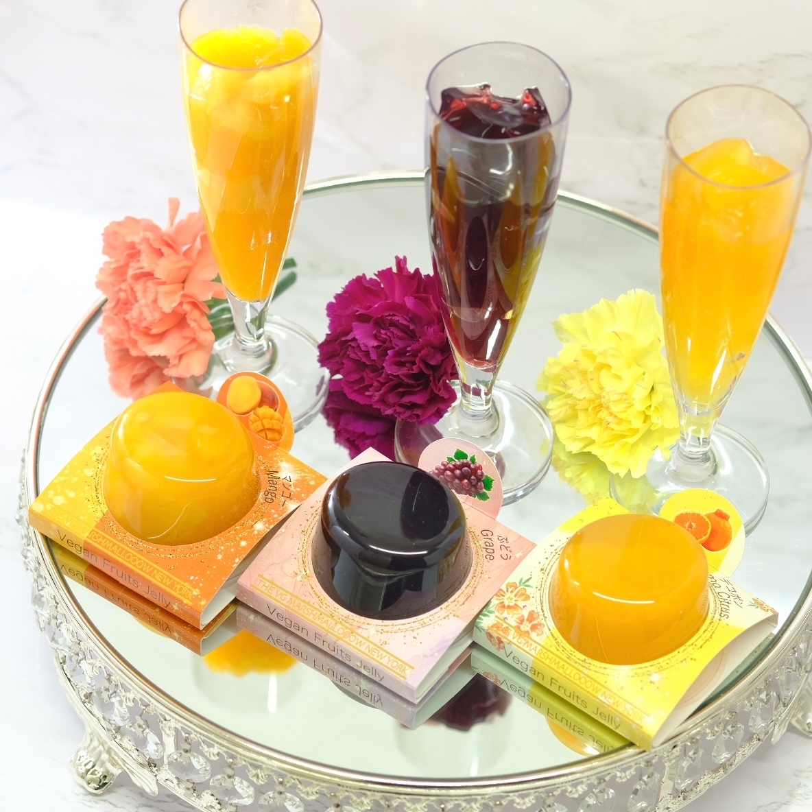 まるでワインのような味わいと、芳香が立ち上がるブドウゼリー、マンゴーの果肉とマンゴーピューレを贅沢に使用したマンゴーゼリー、不知火果汁とデコポンの果肉を丸ごと入れたデコポンゼリーのセット。各2個、計6個入り。