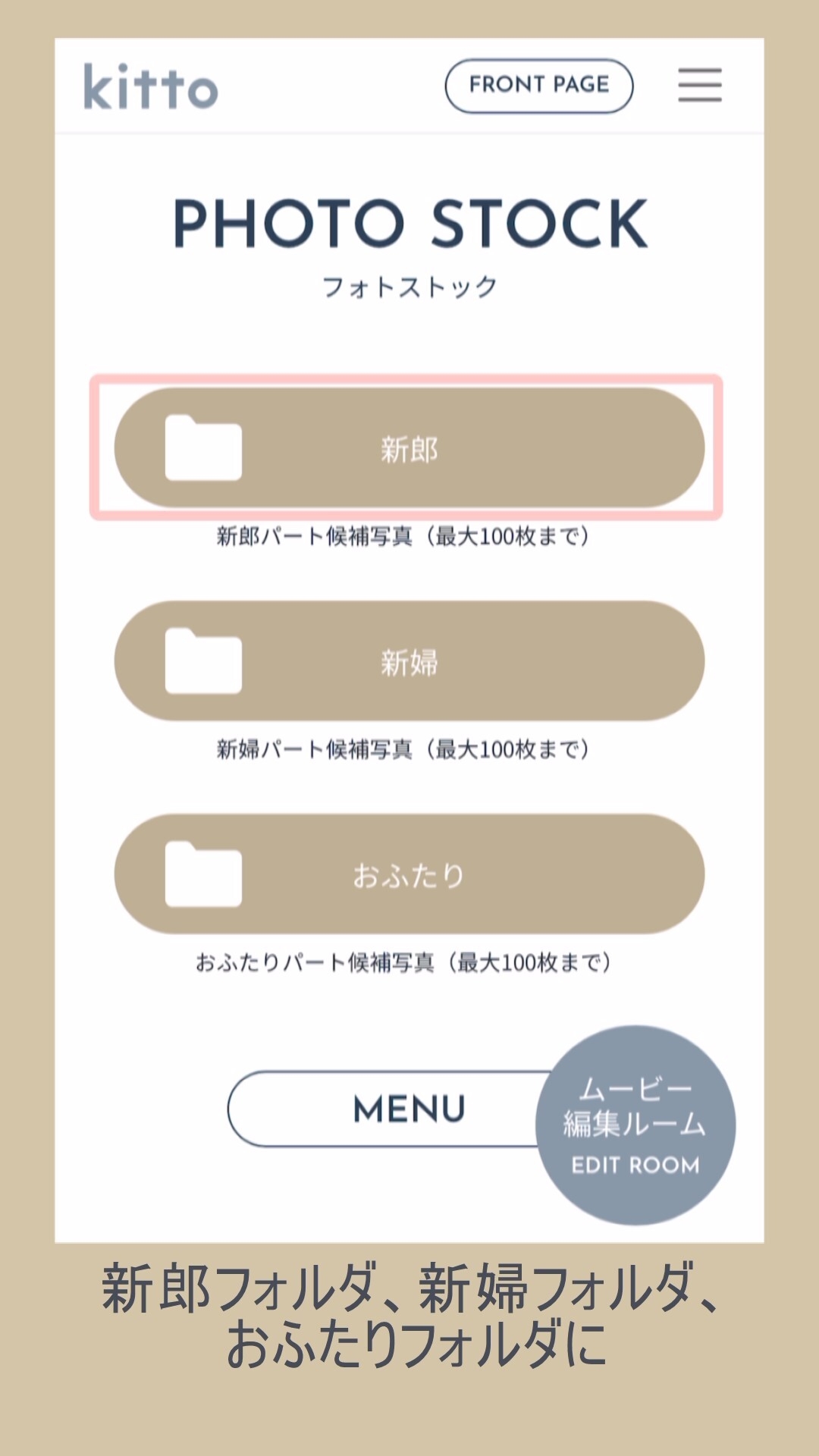 フォトストック機能とは、あらかじめムービーで使用したい写真を新郎フォルダ、新婦フォルダ、おふたりフォルダにそれぞれ100枚までアップロードすることができる機能です。