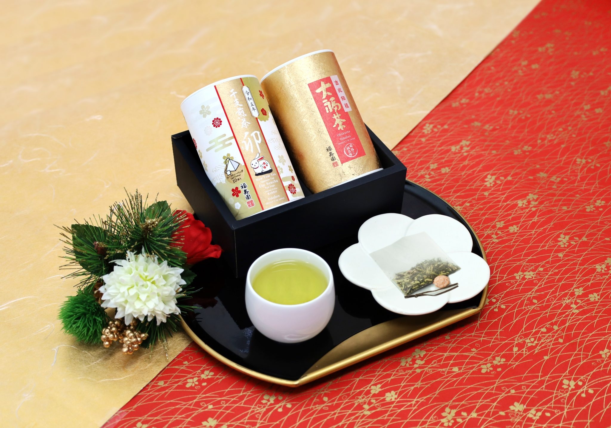 大福茶、干支煎茶ティーバッグ、茎茶「福柱」の3種類のお茶が入ったセットと、大福茶、干支煎茶ティーバッグの2種類のお茶が入ったセットがございます。新年のご挨拶にもぴったりな、縁起の良いギフトとなっております。