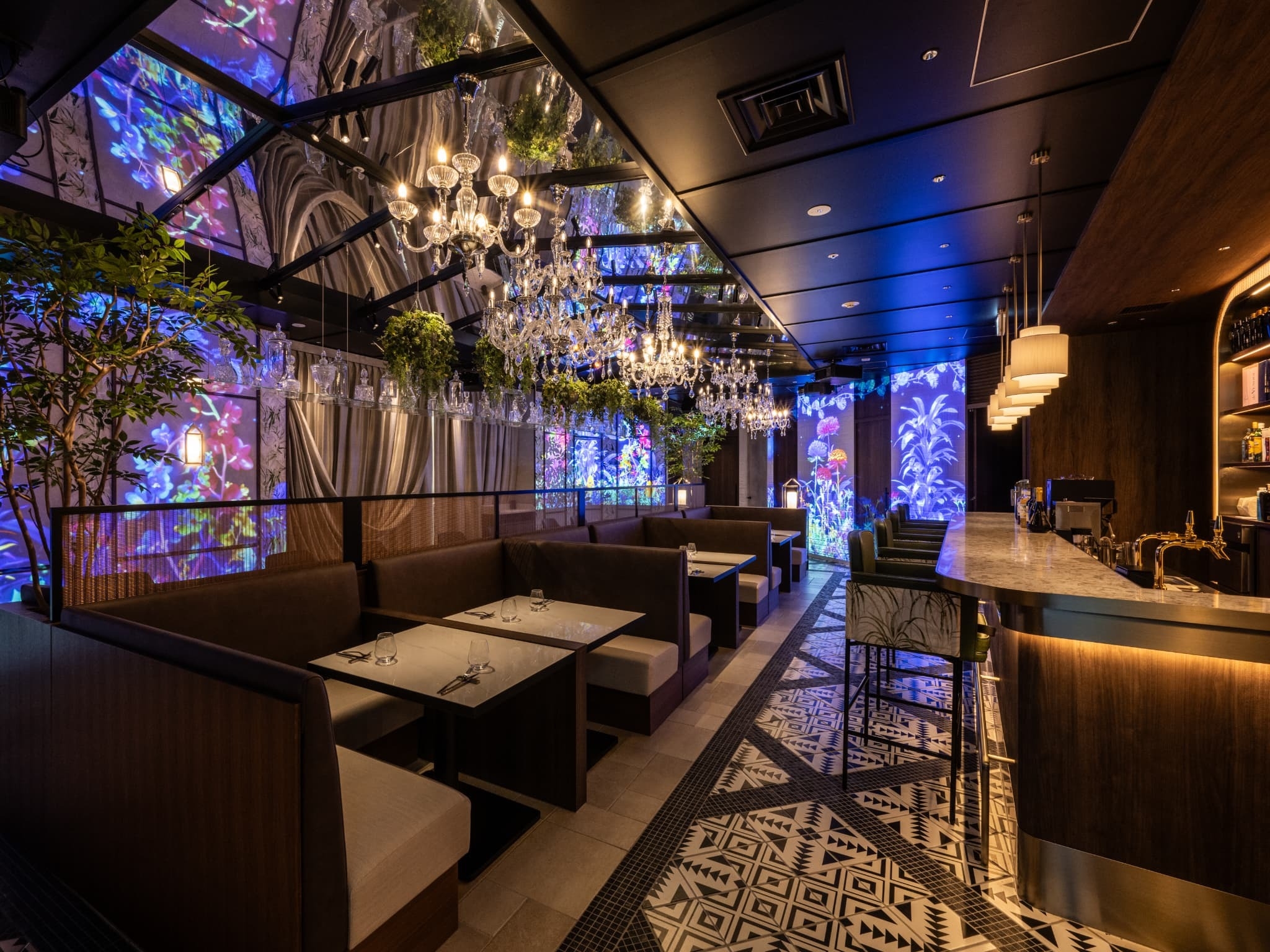 日本を代表するクリエイター集団が手がけるプロジェクションマッピングが、店内を幻想的な空間に変貌させます。内装に合わせた映像と、ボタニカルな雰囲気を醸し出すオリジナル音楽が、五感と知的好奇心を刺激する、革新的な美食体験を提供いたします。