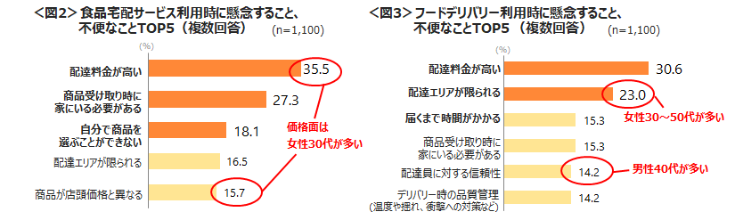 食品宅配サービス、フードデリバリーともに「配達料金が高い」「商品受け取り時に家にいる必要がある」「配達エリアが限られる」といった配達・受取に関する項目がTOP5にランクイン。価格面は女性、特に30代の回答が多く、配達料金や店頭価格との差を気にしている。