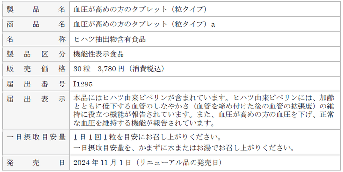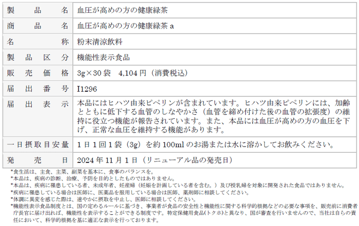 大正製薬株式会社[本社:東京都豊島区 社長:上原 茂](以下、当社)は、「ヘルスマネージ」シリーズの機能性表示食品「血圧が高めの方のタブレット」、「血圧が高めの方の健康緑茶」の届出表示に、「加齢とともに低下する血管のしなやかさ(血管を締め付けた後の血管の拡張度)の維持に役立つ」機能(ヒハツ由来ピペリンの機能)を追加したリニューアル品を11月1日(金)より、当社オンラインショップ「大正製薬ダイレクト」等で発売します。