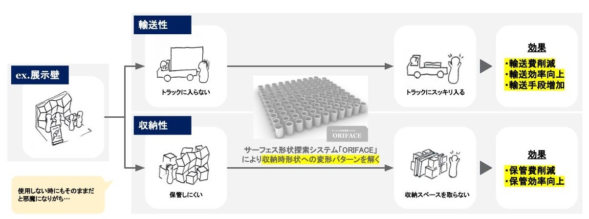 「ORIFACE for Transport」は、サーフェス形状探索システム「ORIFACE」を用いることで変形可能な表面構造に置き換え、製品の輸送性/収納性を向上することに特化したサービスです。