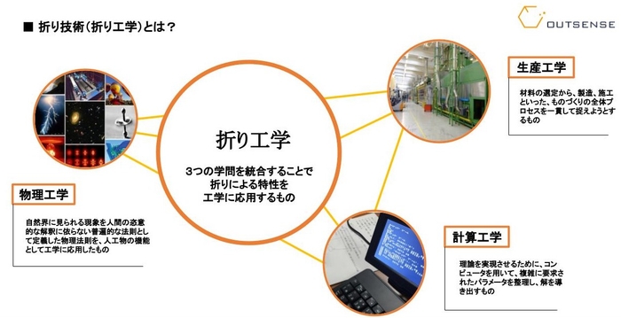 物理工学、生産工学、計算工学を掛け合わせ、折りを工学用途に応用したものが折り工学です。