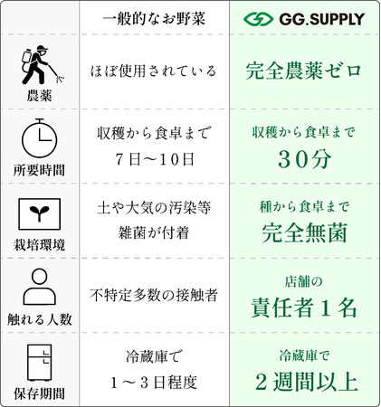 私たちが毎⽇⼝にしている野菜は通常、収穫から7日~10日以上も経過していると⾔われています。⾷卓に運ばれるまでの段階で栄養素が失われるだけでなく、沢⼭の⼈の⼿に触れられているため、多くの雑菌に触れていることになります。GG.SUPPLYは収穫より最短30分で皆様の⾷卓にお届け致します。(特許申請済)