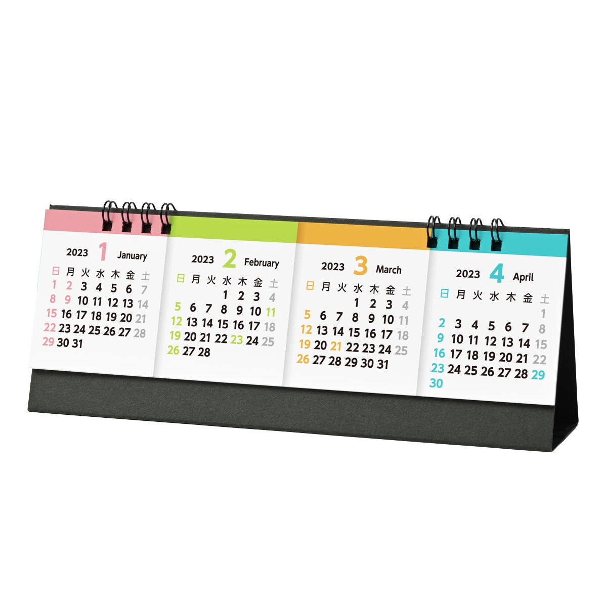 同カレンダーは、4ヶ月分の日付が横並びに同じレイアウトで表示されており、病院の診察室やクリニックなどの受付カウンターで威力を発揮します。