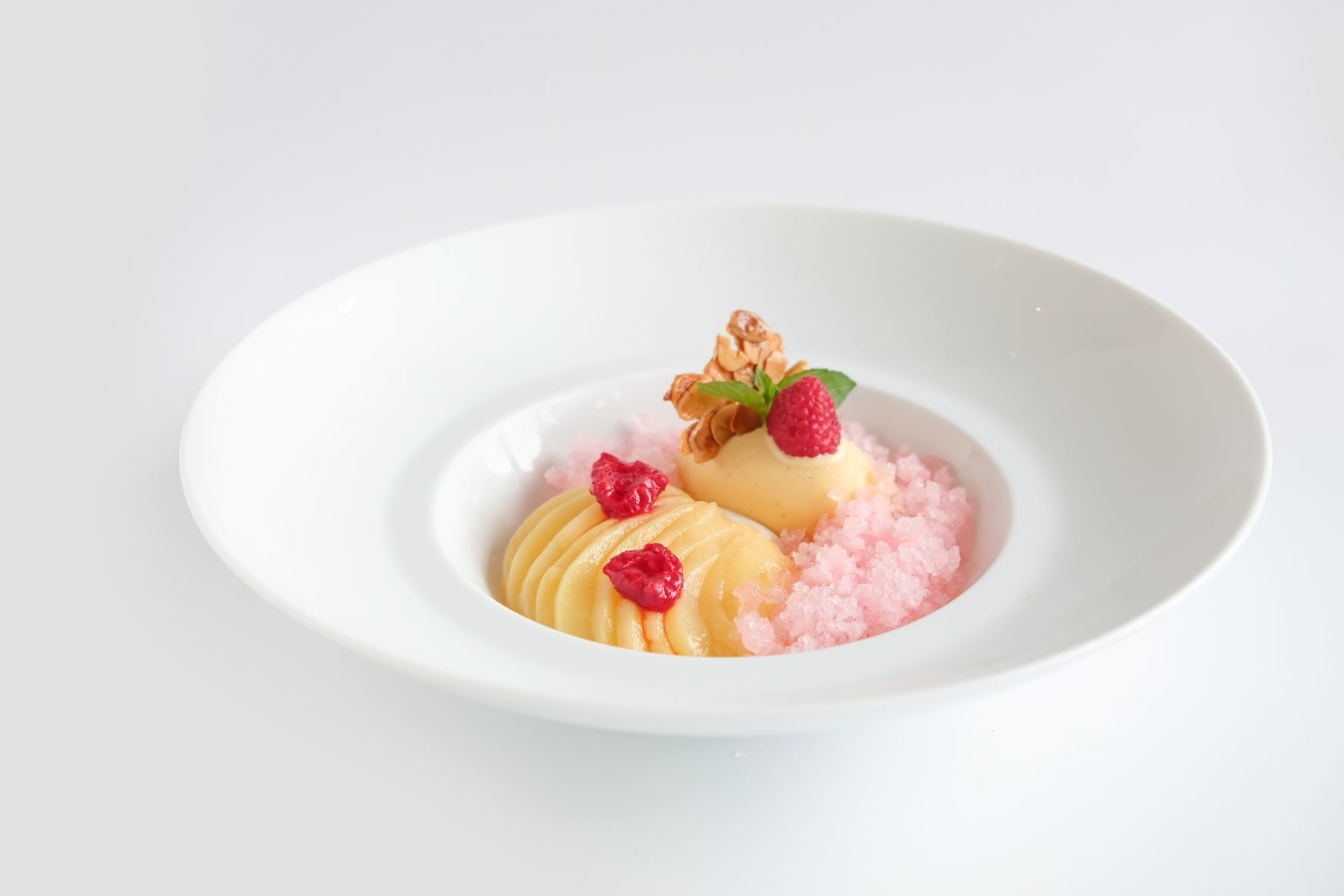 シェフ星野晃彦が今年手掛けるピーチ・メルバは、伝統の再構築。白桃のコンポートにマラスキーノ風味の淡いピンクのグラニテをたっぷり添えて、ヴァニラアイスクリームとラズベリーと一緒にお花畑のような世界を表現しました。
