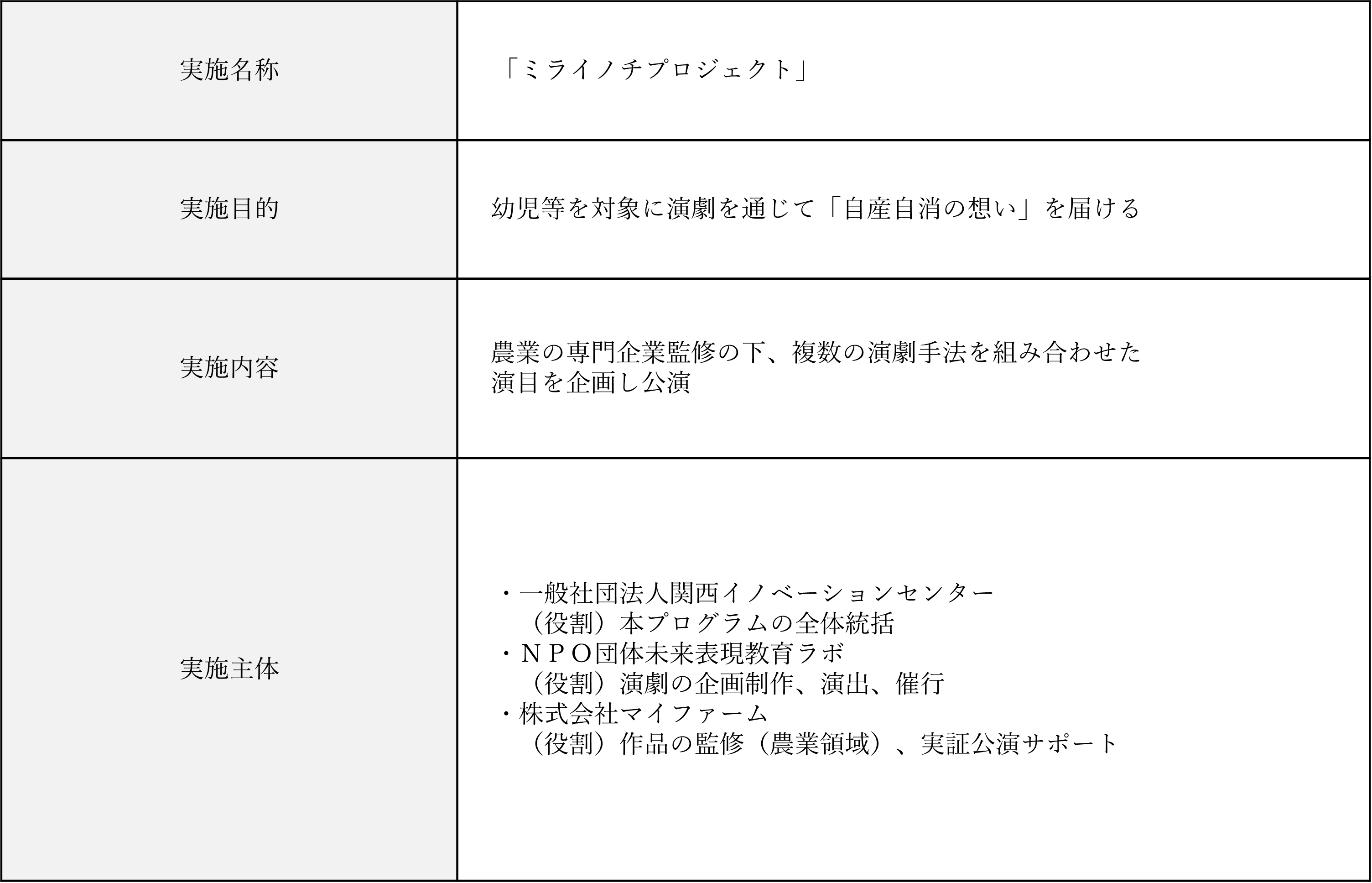 一般社団法人関西イノベーションセンター(代表理事:早乙女(そうとめ) 実(みのる)、以下当社団)と、株式会社マイファーム(代表取締役:西辻(にしつじ) 一真(かずま)、以下マイファーム)、NPO団体未来表現教育ラボ(代表:大野(おおの) たかよし、以下Mラボ)の3社は共同で、複数の演劇手法を融合させ「自産自消※の想い」を届ける、『ミライノチプロジェクト』を始動いたします。