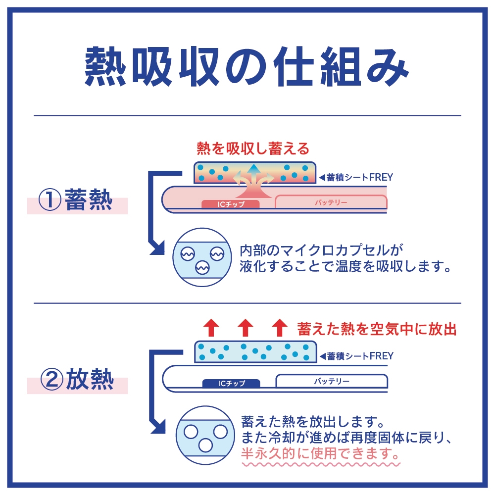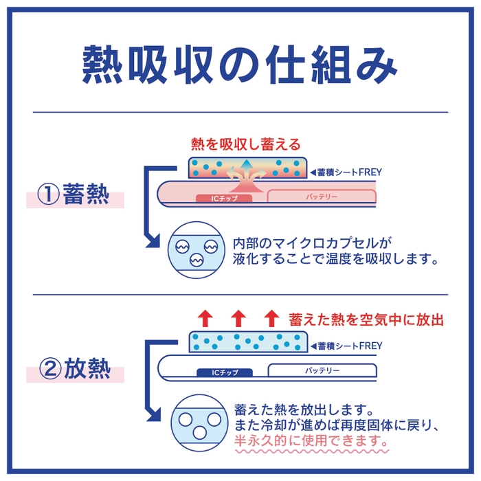 日本の共同技研化学株式会社の蓄熱シート「FREY」を使用。シートの内部のマイクロカプセルが液化することで熱を吸収します。蓄えた熱が空気中に放出され、冷却が進むとマイクロカプセルは固体に戻る仕組みで、半永久的に繰り返し使用することができます。