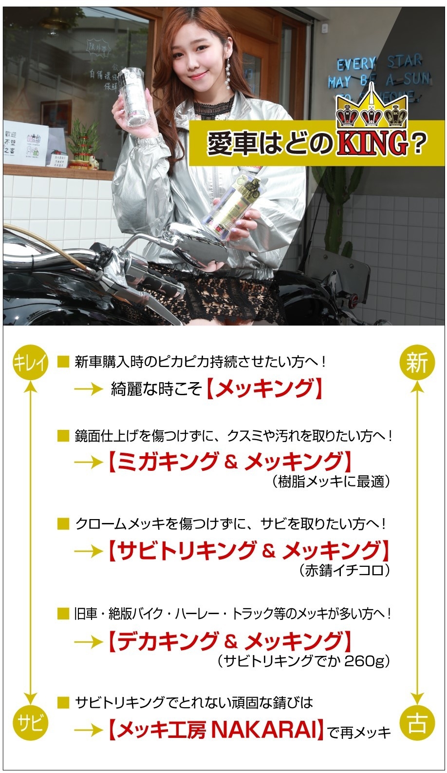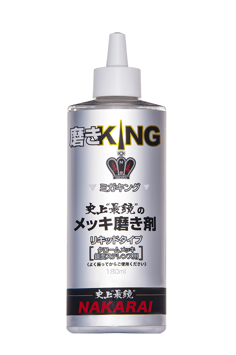 そんな強いこだわりと技術を持つNAKARAIから今回販売されたクロムメッキ用サビ取り剤 ミガキングは、リキッドタイプになっているためクロムメッキの表面を傷つけることなく、くすみ、汚れだけに反応し、表面を綺麗に磨き上げます。