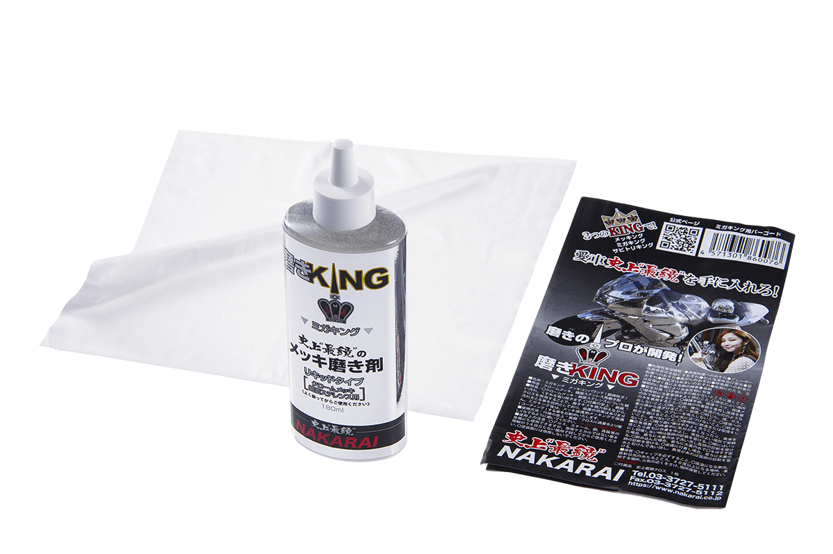 今回発売されたクロムメッキ用磨き剤「ミガキング」は、内容量180ml・史上最鏡クロス1枚付き。