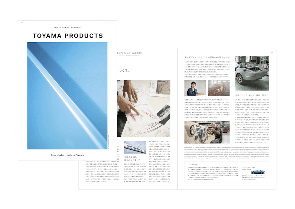 リーフレットでは、富山プロダクツがうまれる原点としての富山の風土や今年度の新選定商品を紹介するほか、商品づくりにまつわる人やモノのストーリーを取材する企業特集を掲載。今回の特集は「変わらない信念で、愛され続けるデザイン」をテーマに、株式会社光岡自動車、株式会社山口久乗の2社をピックアップし、経営者やデザイナーへのインタビューを掲載しています。