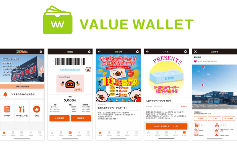 「ヤマキシアプリ」は、ネオスとバリューデザインが共同展開するスマートフォン決済サービス基盤【Value Wallet】をベースに開発しており、アプリでのカードレス決済のほか、電子マネー残高のチャージ、新商品やお買い得商品情報の閲覧などを行えます。また、同時にカードタイプの「ヤマキシ プリペイドカード」もバリューデザインより提供し、物理的なカードを好むお客様に対しても、キャッシュレス決済の利便性を体験いただき、利用促進を図ります。