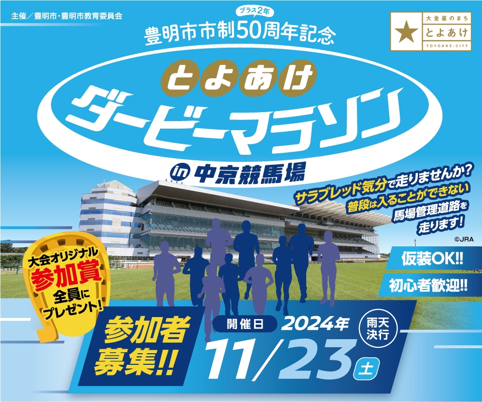 豊明市は2022年8月に市制50周年を迎え、中京競馬場にてマラソン大会を行うことを計画しておりましたが、新型コロナウイルス感染拡大により開催を見送りました。2年遅れではありますが、この度「とよあけダービーマラソンin中京競馬場」として2024年11月23日(土・祝)に開催することを決定しました。
