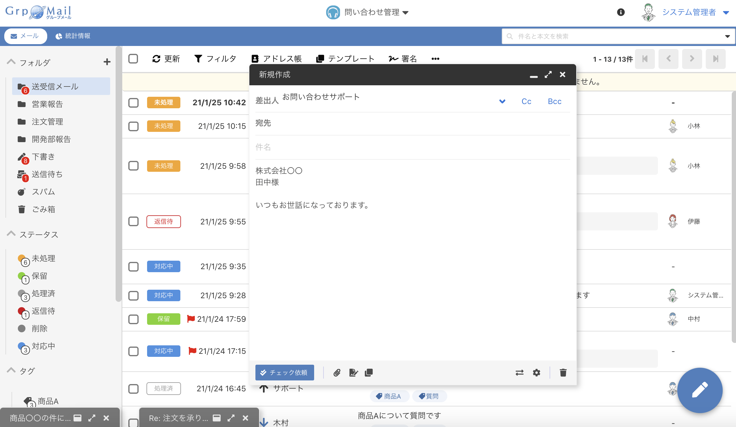 メール自動振り分け/タグ管理/対応状況・履歴管理/放置メール警告機能 など