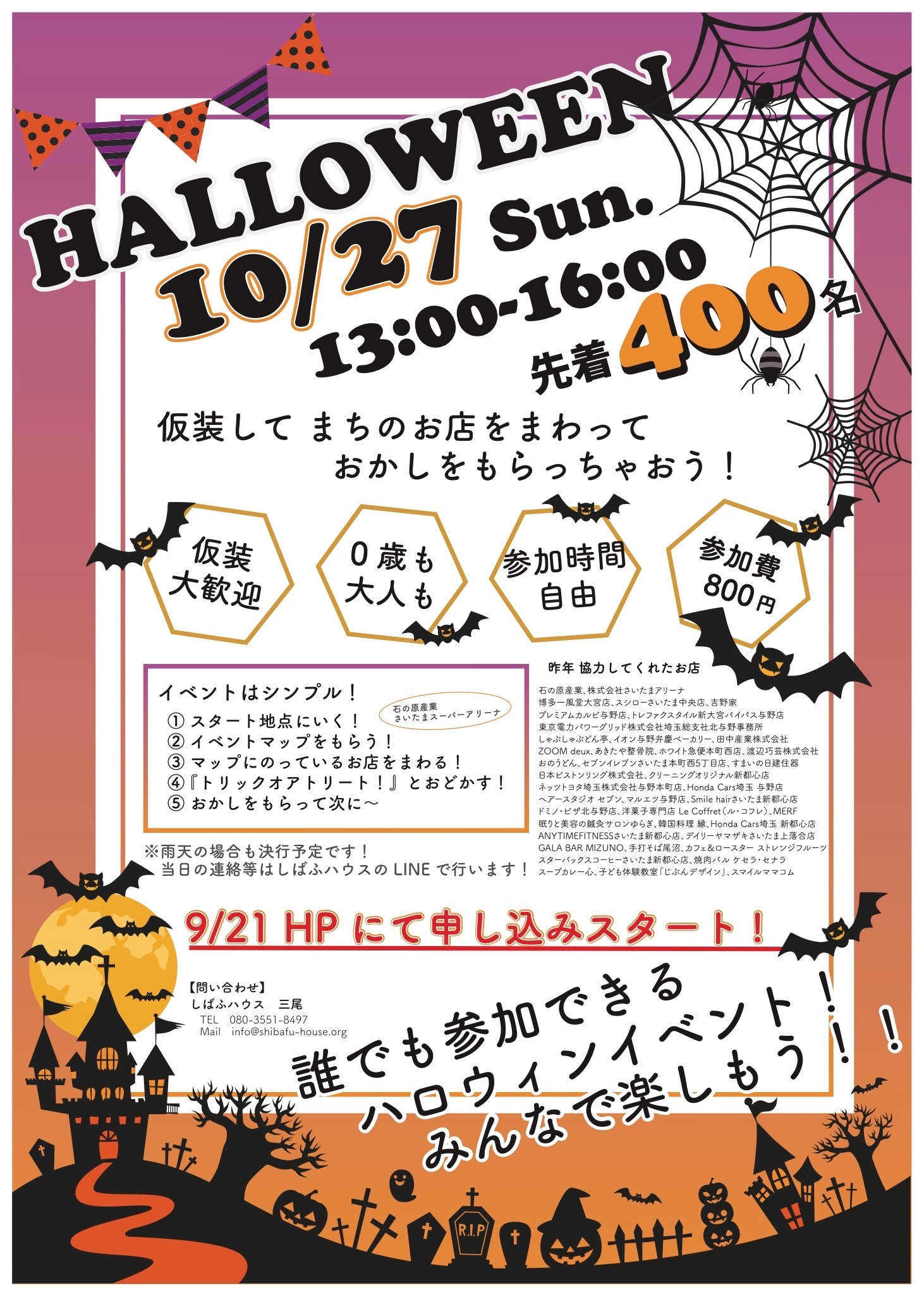 さいたま市中央区(与野)にある『JRさいたま新都心駅』から東方面への通りを中心に、2kmの道がイベントのエリアとなります。参加者(400名)は受付でもらったカードを元に、お店や企業をまわり、歩きながら、お菓子をもらうというイベントです。