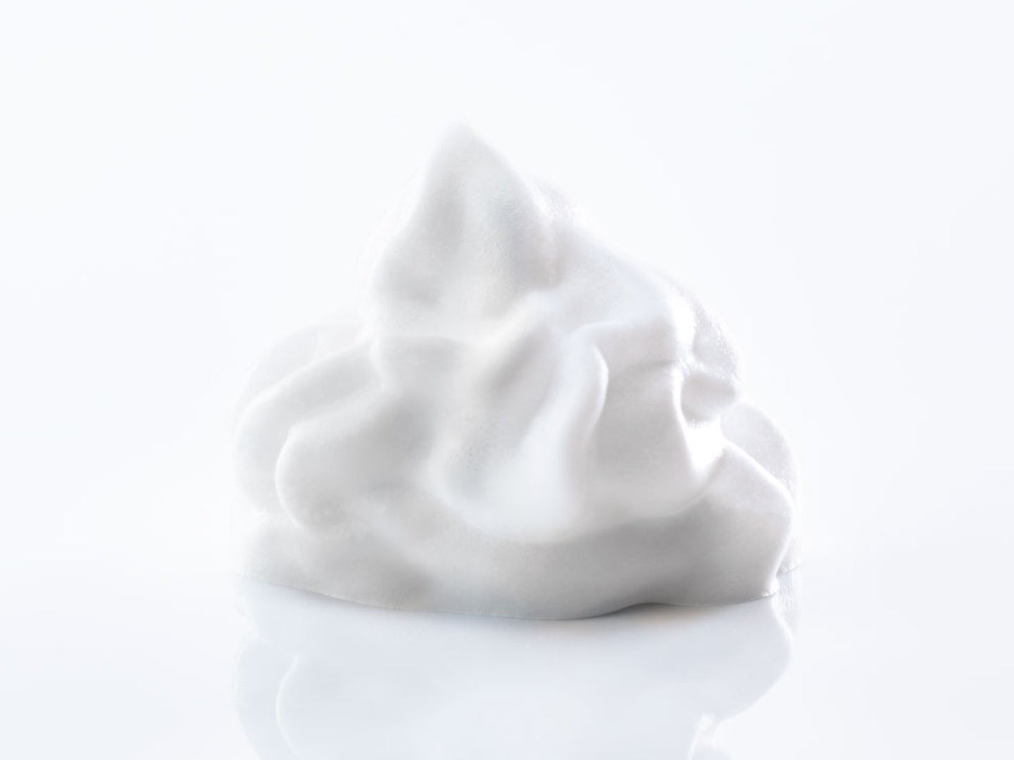 泡タイプの容器は、ポンプ内部で液体と空気を一定の割合で混ぜ合わせ、細かいメッシュ(網目)を通して押し出すことで、きめ細かい泡をつくっています。さらに、本商品では、ホイップ形状を生み出す先端部のアタッチメントを新開発。中身の配合成分にも工夫を加えたことで、これまで以上に濃密でホイップのようなもちもちの泡を作りやすくなりました。