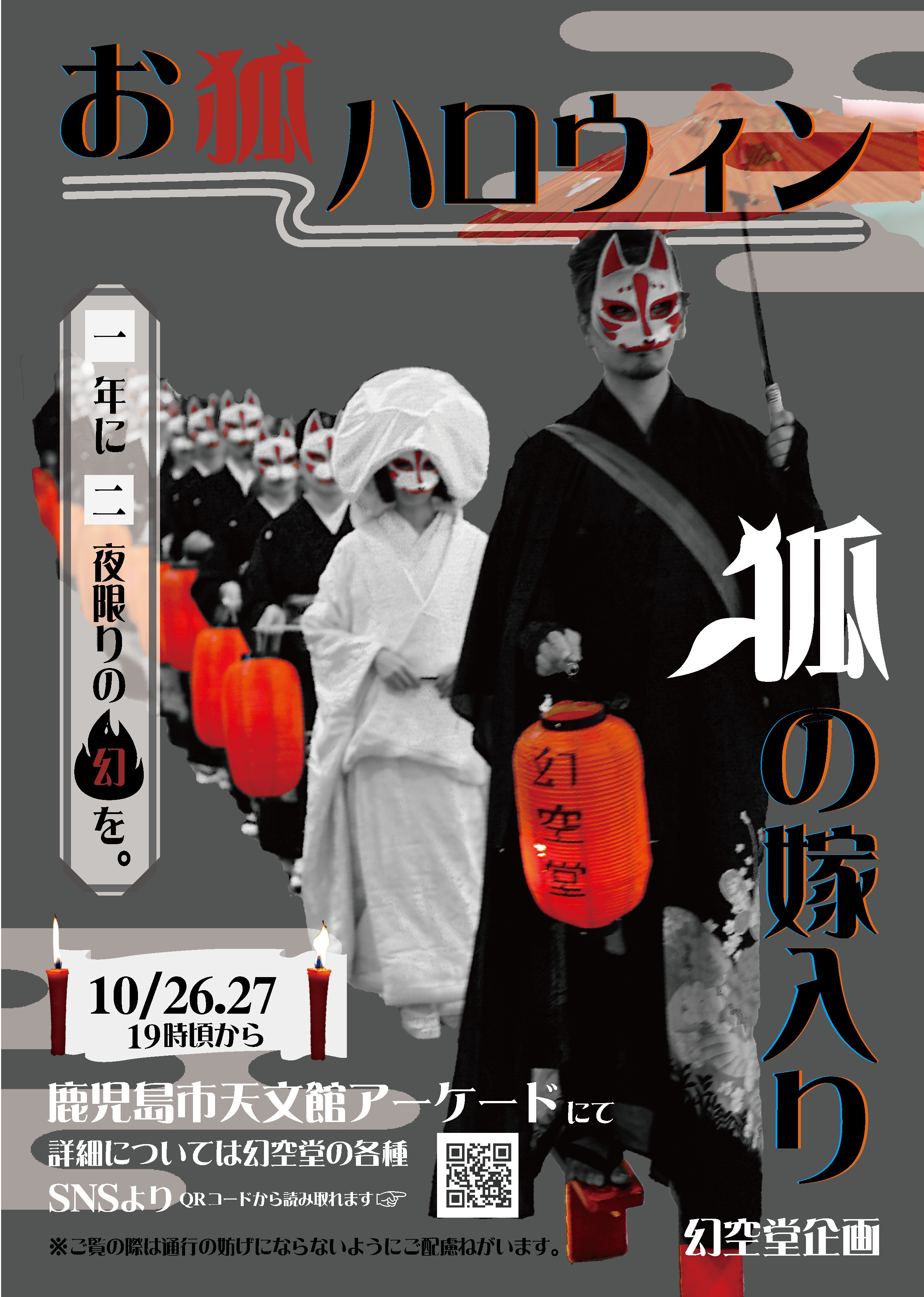 鹿児島にある狐のお面屋さん「幻空堂」では、制作したお面を装着して楽しめるハロウィンのイベントとして『狐の嫁入り行列 ~お狐ハロウィン2024~」を、10月26日(土)27日(日)の夜に開催、鹿児島市の繁華街に位置する天文館通りを練り歩きます。嫁入り行列は無料でご見学いただけます。