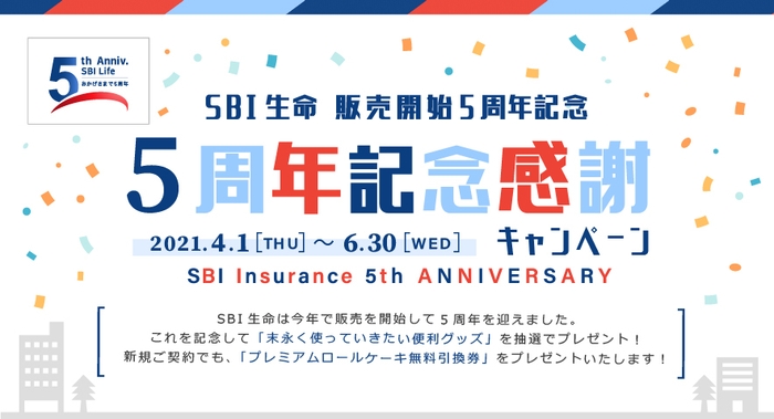 SBI⽣命保険株式会社(本社:東京都港区、代表取締役社⻑:⼩野尚、以下「SBI⽣命」)は、販売開始から5周年を迎えるに際して、⽇頃のご愛顧に感謝し、2021年4⽉1⽇(⽊)より「5周年記念感謝キャンペーン」を実施いたします。