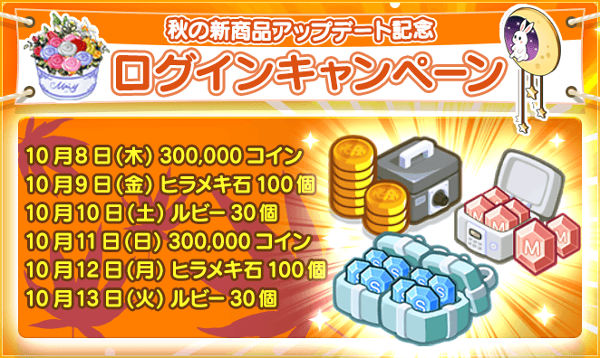 また、10月8日(木)~10月13日(火)23:59の期間に毎日ログインすることで、ゲーム内の報酬がプレゼントされる「ログインキャンペーン」を実施いたします。