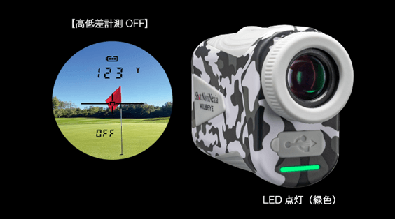 MODEボタンを長押しすることで高低差(目安距離)情報がOFFになり、本体にあるLEDが緑色に点灯します。