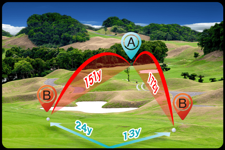 通常の3点間計測は、先に起点となるものを補足し、そこからピンフラッグまでを計測します。